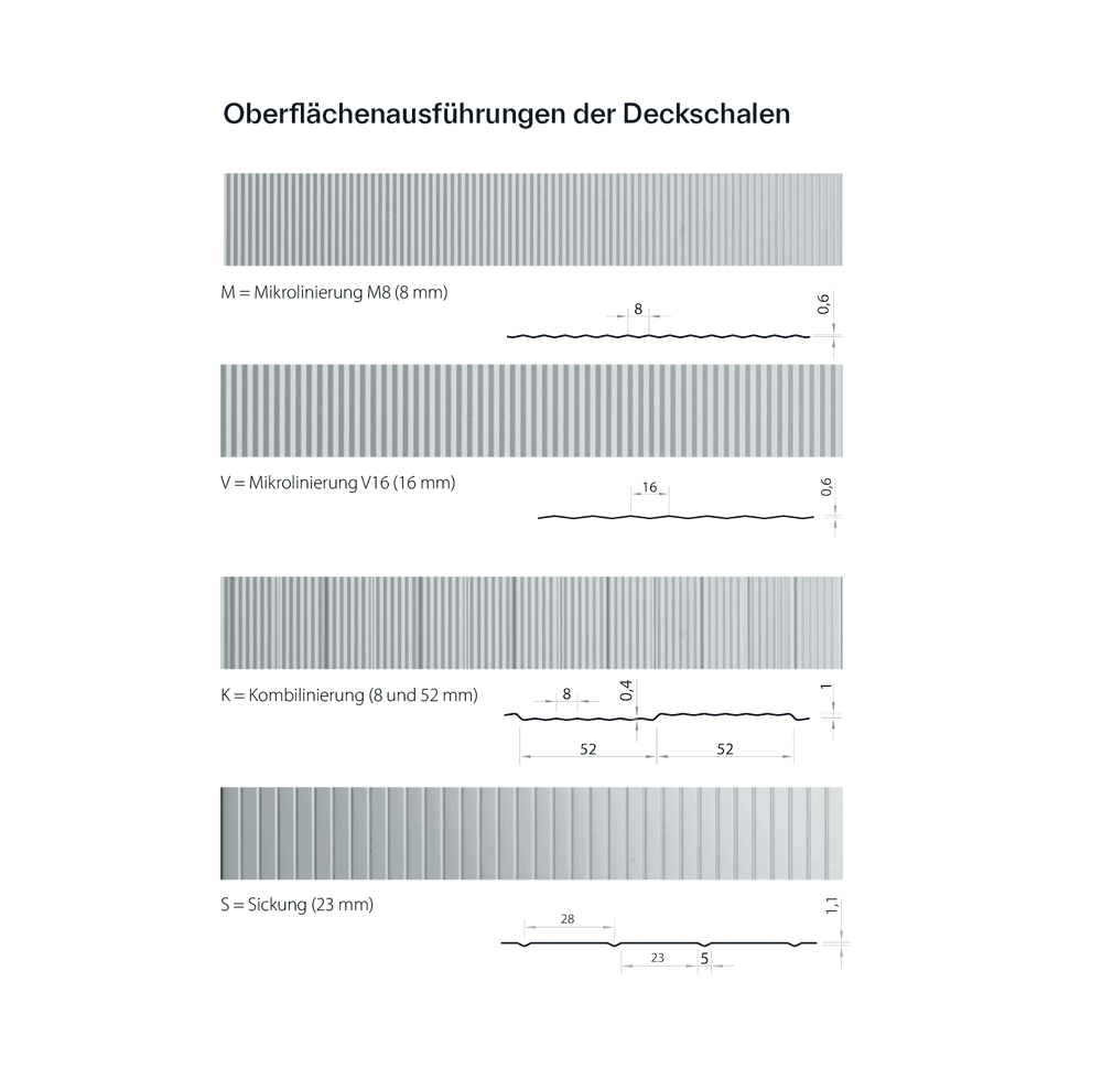 Je nach Anwendungsbereich und gewünschter Wärmedämmung kann eine Dicke von 80 bis 150 mm gewählt werden. Die Baubreite liegt bei 1.000 mm und die empfohlene maximale Länge beträgt 18 Meter. Sonderbaubreiten sind auf Anfrage erhältlich.